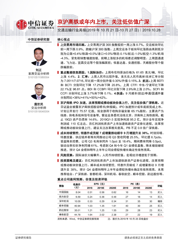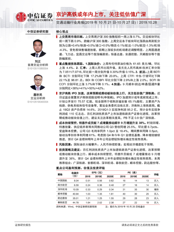 【中信证券】【20191028】交通运输行业周报:京沪高铁或年内上市,关注低估值广深-24页