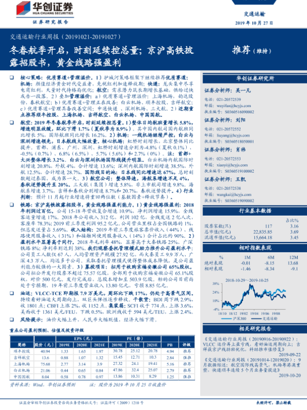 【华创证券】【20191027】交通运输行业周报:冬春航季开启,时刻延续控总量;京沪高铁披露招股书,黄金线路强盈利-22页