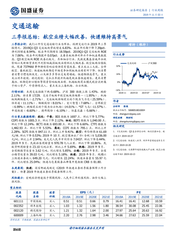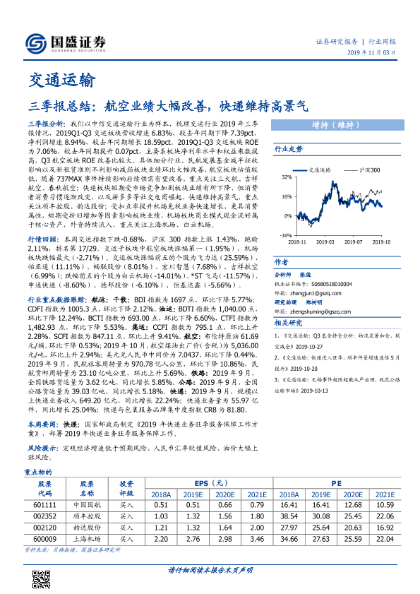 【国盛证券】【20191103】交通运输行业周报:三季报总结:航空业绩大幅改善,快递维持高景气-24页