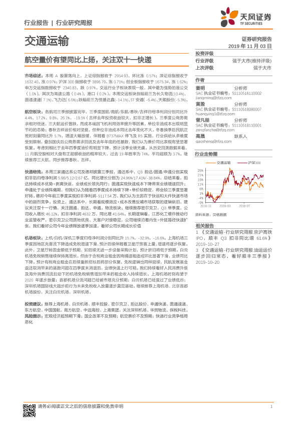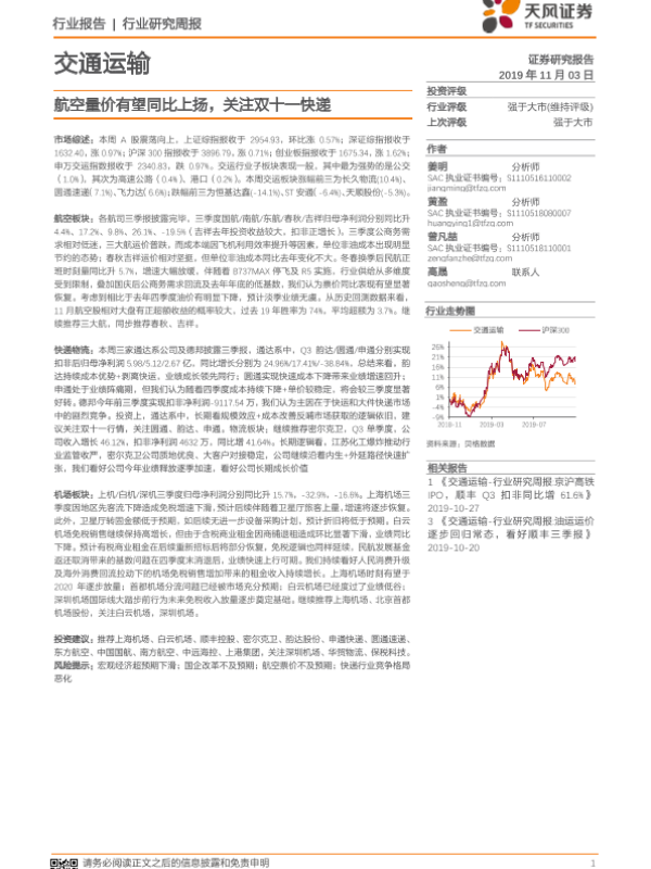 【天风证券】【20191103】交通运输行业研究周报:航空量价有望同比上扬,关注双十一快递-27页