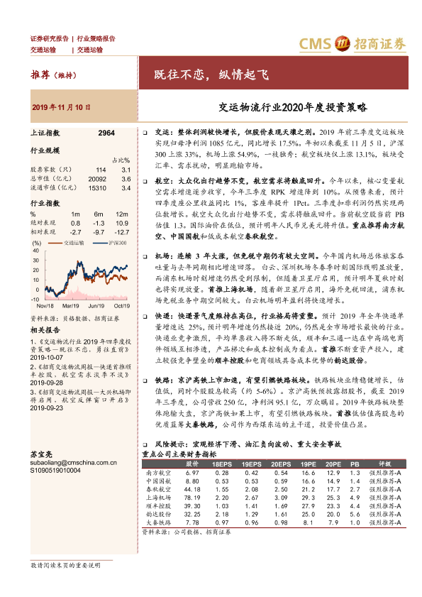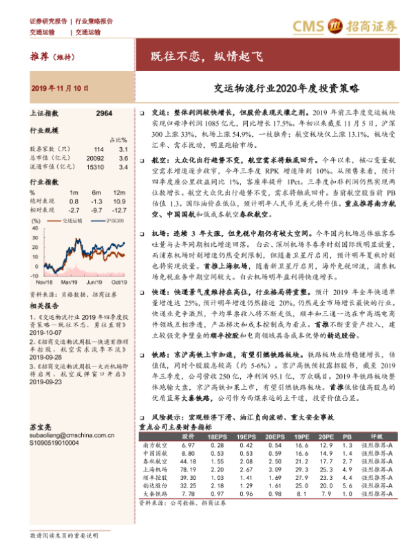 【海通证券】【20191110】交运物流行业2020年度投资策略:既往不恋,纵情起飞-29页
