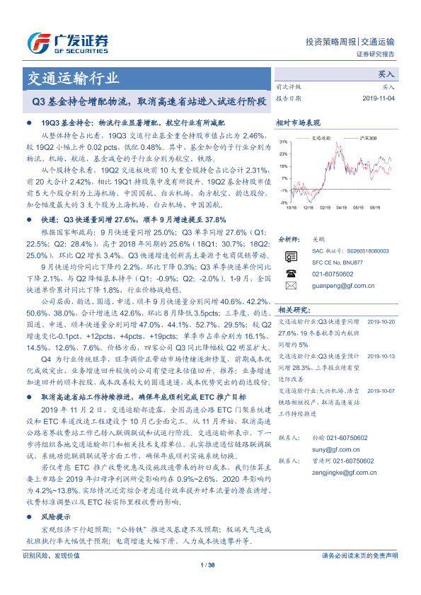 【广发证券】【20191104】Q3基金持仓增配物流,取消高速省站进入试运行阶段-38页