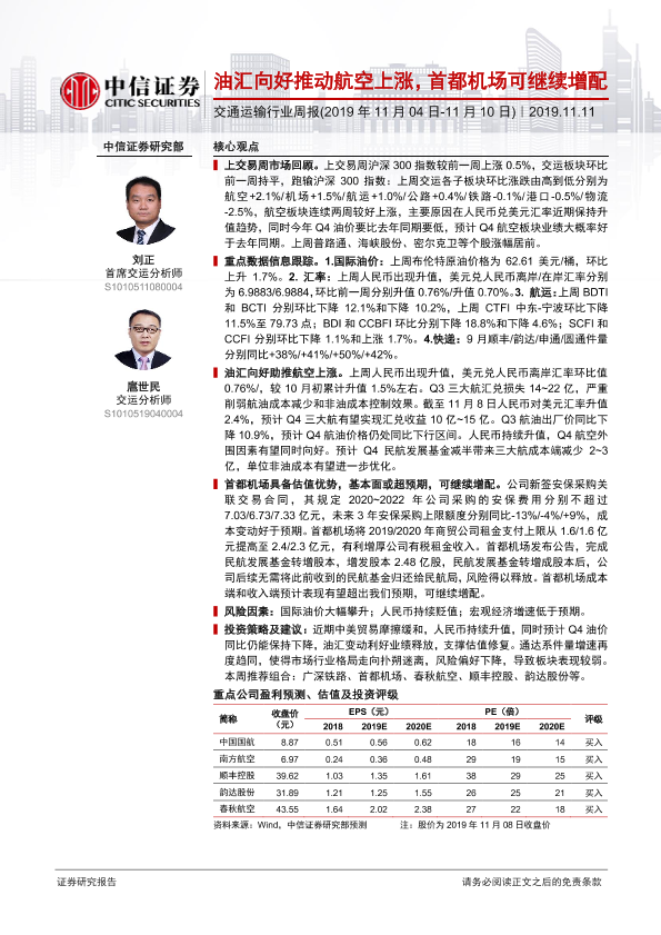 【中信证券】【20191111】交通运输行业周报:油汇向好推动航空上涨,首都机场可继续增配-25页