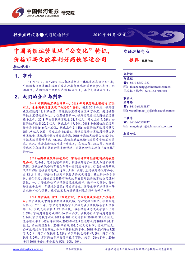 【银河证券】【20191112】中国高铁运营呈现“公交化”特征,价格市场化改革利好高铁客运公司-4页