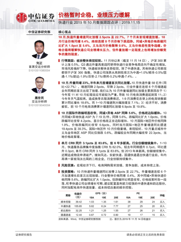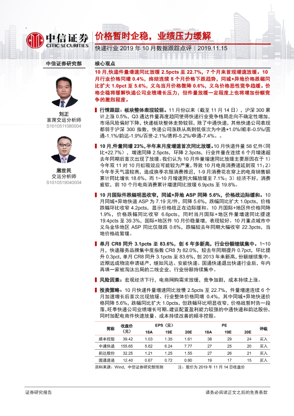 【中信证券】【20191115】快递行业2019年10月数据跟踪点评-11页