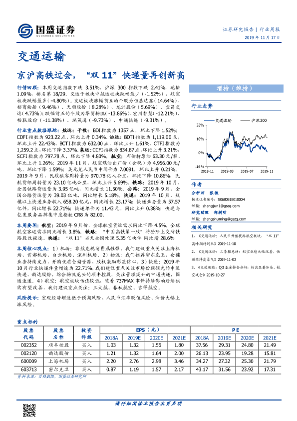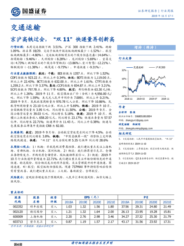 【国盛证券】【20191117】交通运输行业周报:京沪高铁过会,“双11”快递量再创新高-18页