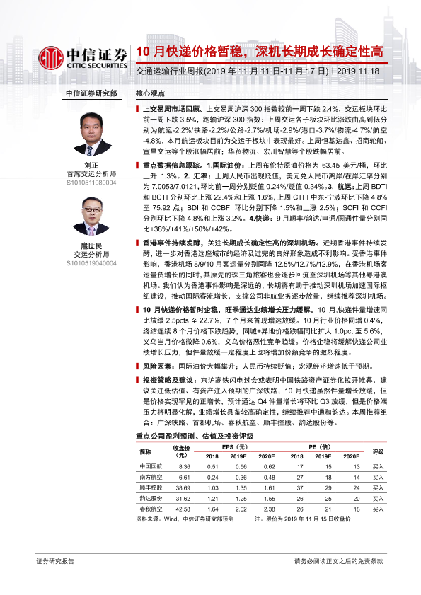 交通运输 快递价格 快递行业 油价汇率 深圳机场