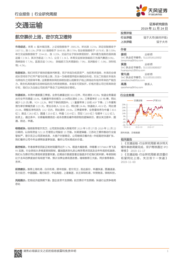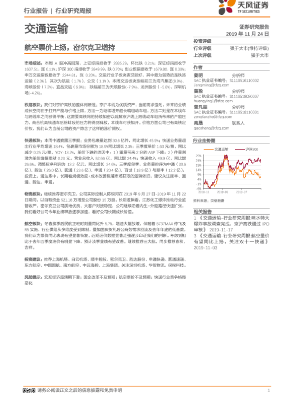 【天风证券】【20191124】交通运输行业研究周报:航空票价上扬,密尔克卫增持-16页