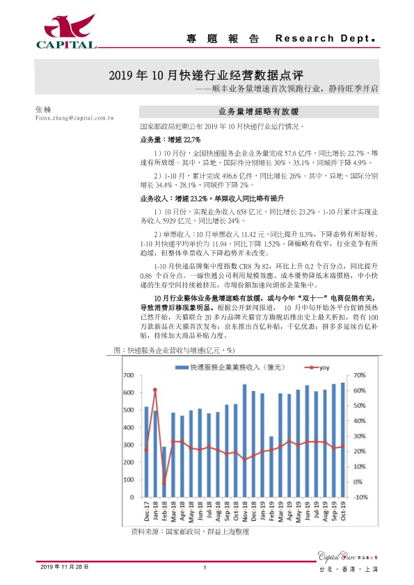 【群益证券】【20191128】2019年10月快递行业经营数据点评:顺丰业务量增速首次领跑行业,静待旺季开启-7页