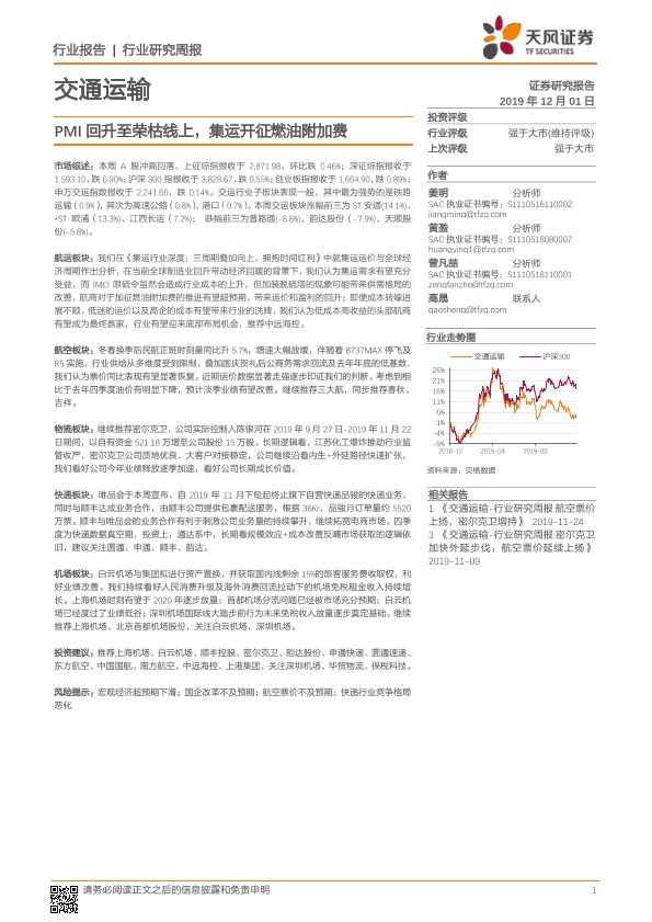 【天风证券】【20191201】交通运输行业研究周报:PMI回升至荣枯线上,集运开征燃油附加费-15页