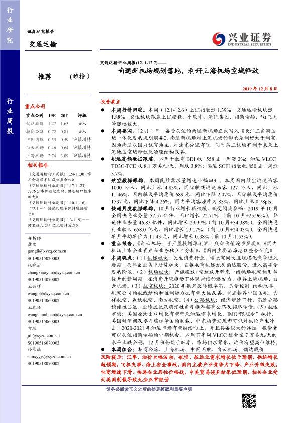 【兴业证券】【20191208】交通运输行业周报:南通新机场规划落地,利好上海机场空域释放-16页