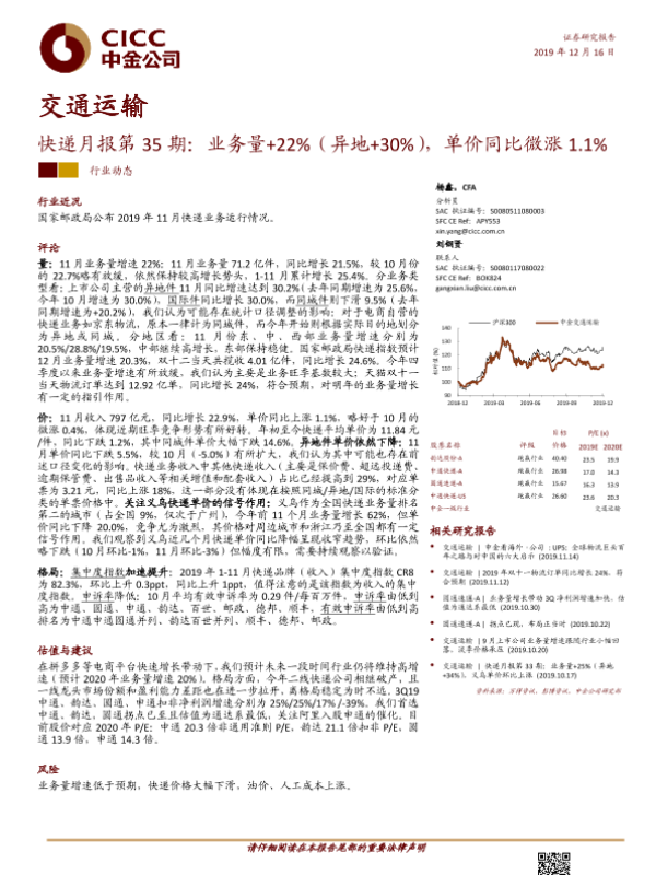 【中金公司】【20191216】快递月报第35期:业务量+22%(异地+30%),单价同比微涨1.1%-14页