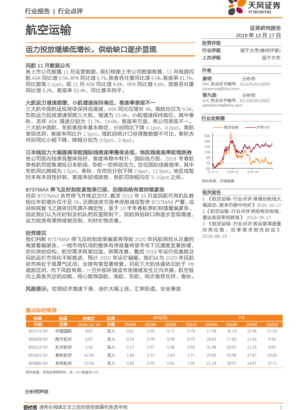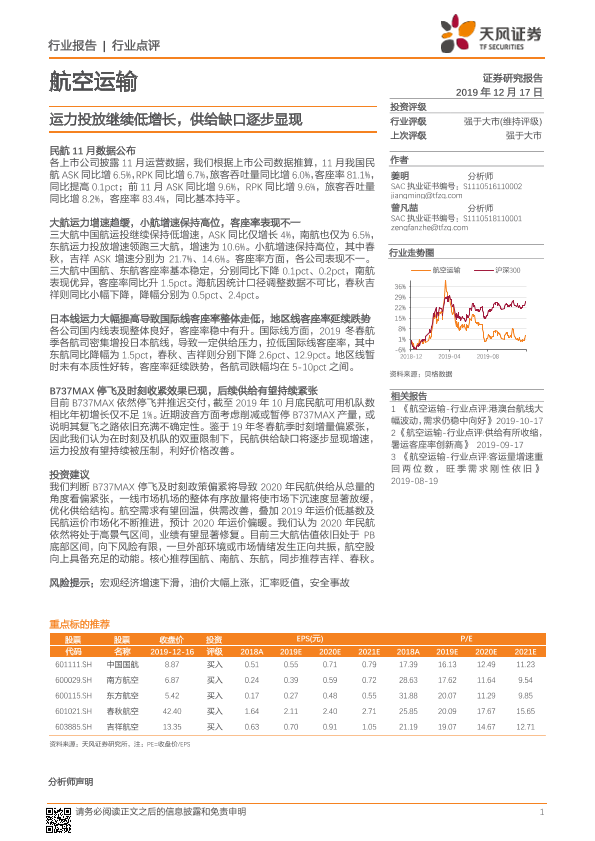 【天风证券】【20191217】航空运输行业点评:运力投放继续低增长,供给缺口逐步显现-2页