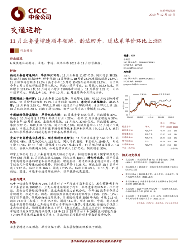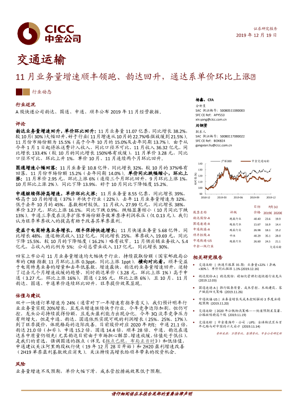 【中金公司】【20191219】11月业务量增速顺丰领跑、韵达回升,通达系单价环比上涨-7页