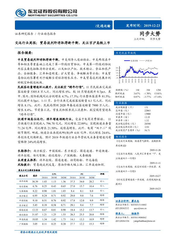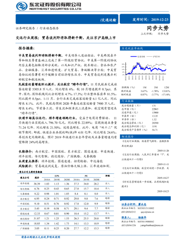 【东北证券】【20191223】交运行业周报:贸易谈判即将取得新平衡,关注京沪高铁上市-15页