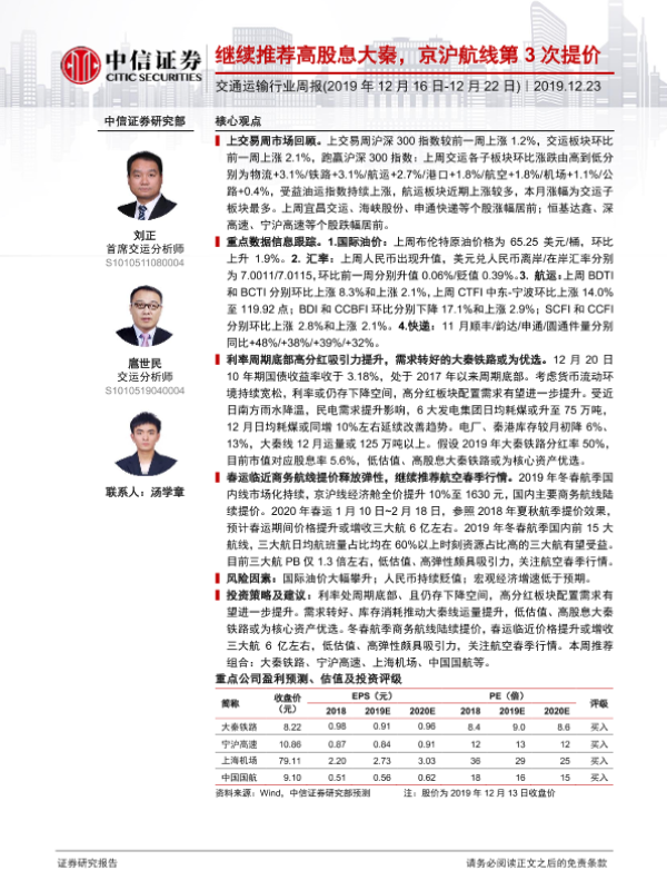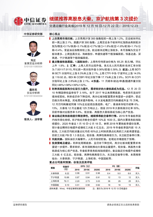 【中信证券】【20191223】交通运输行业周报:继续推荐高股息大秦,京沪航线第3次提价-24页