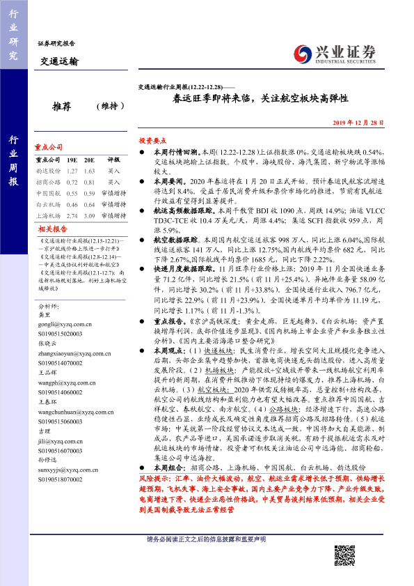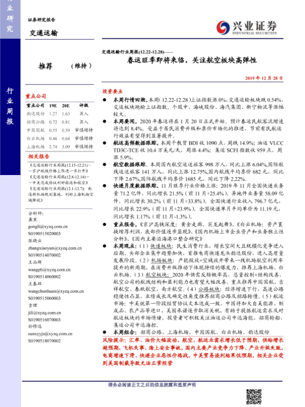 【兴业证券】【20191228】交通运输行业周报:春运旺季即将来临,关注航空板块高弹性-16页