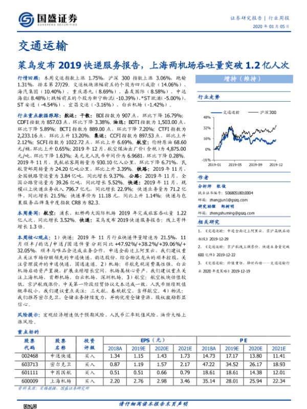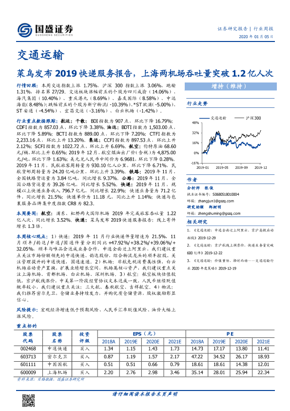 【国盛证券】【20200105】交通运输行业周报:菜鸟发布2019快递服务报告,上海两机场吞吐量突破1.2亿人次-19页