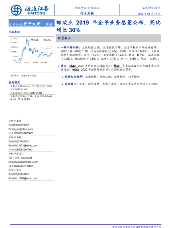 【海通证券】【20200112】交通运输行业周报:邮政业2019年全年业务总量公布,同比增长30%-8页