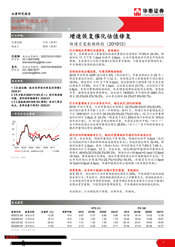 【华泰证券】【20200119】快递月度数据跟踪:增速恢复催化估值修复-4页
