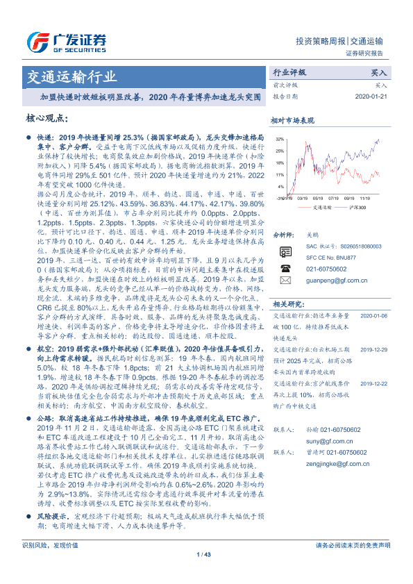 【广发证券】【20200121】交通运输行业投资策略周报:加盟快递时效短板明显改善,2020年存量博弈加速龙头突围-43页