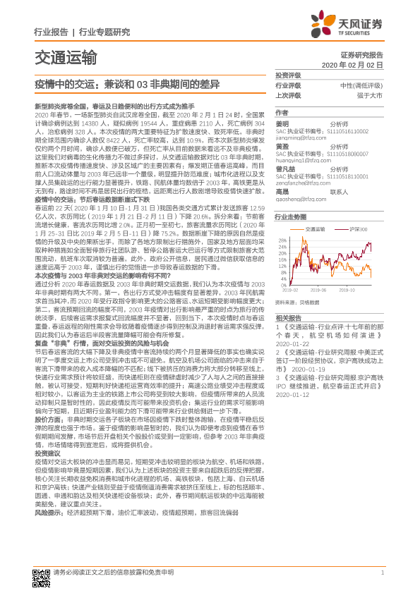 【天风证券】【20200202】疫情中的交运:兼谈和03非典期间的差异-23页