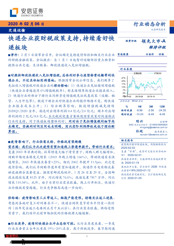 【安信证券】【20200206】交通运输行业动态分析:快递企业获财税政策支持,持续看好快递板块-4页