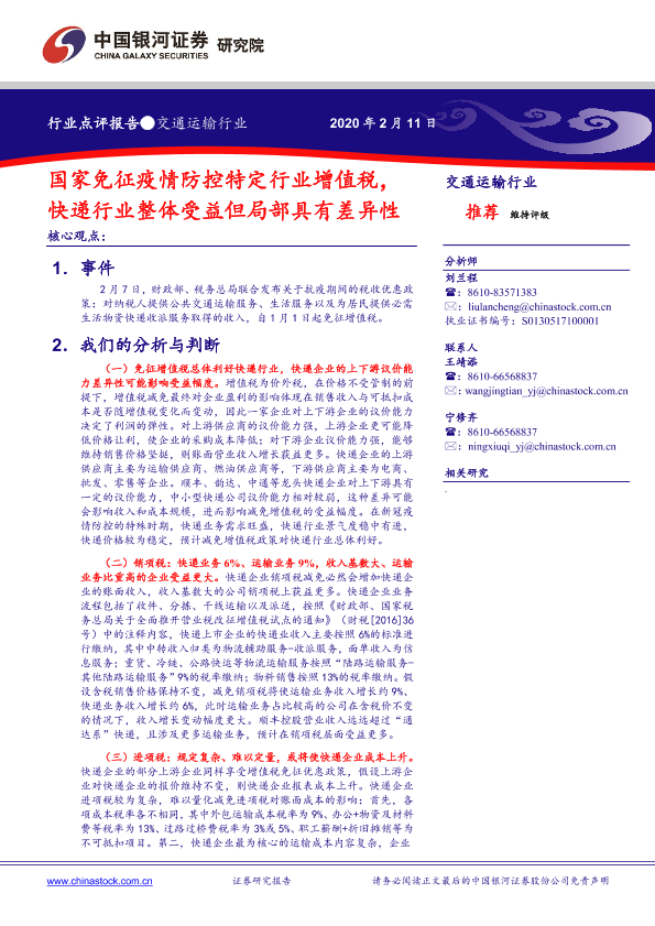 【银河证券】【20200211】国家免征疫情防控特定行业增值税,快递行业整体受益但局部具有差异性-5页