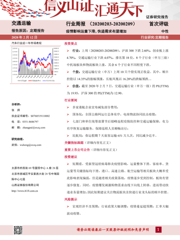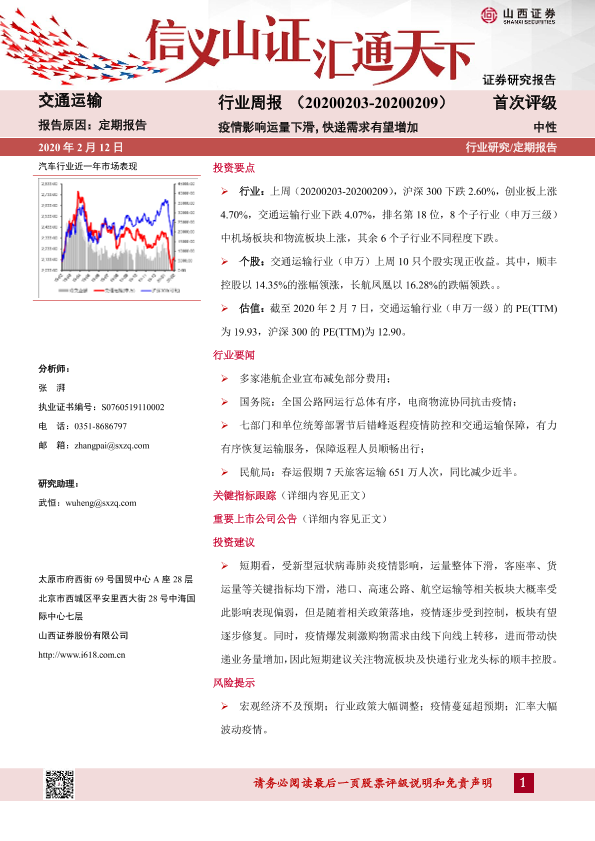【山西证券】【20200212】交通运输行业周报:疫情影响运量下滑,快递需求有望增加-15页