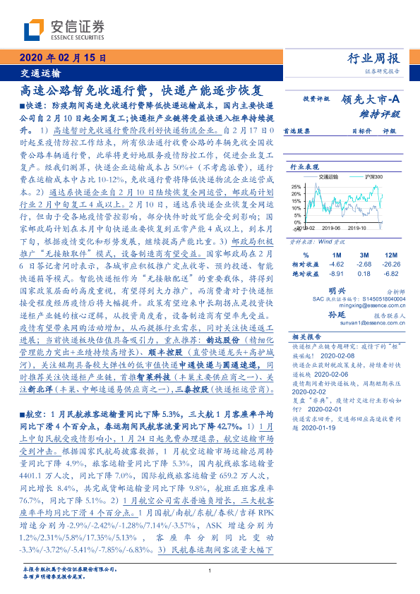 【安信证券】【20200215】交通运输行业周报:高速公路暂免收通行费,快递产能逐步恢复-19页