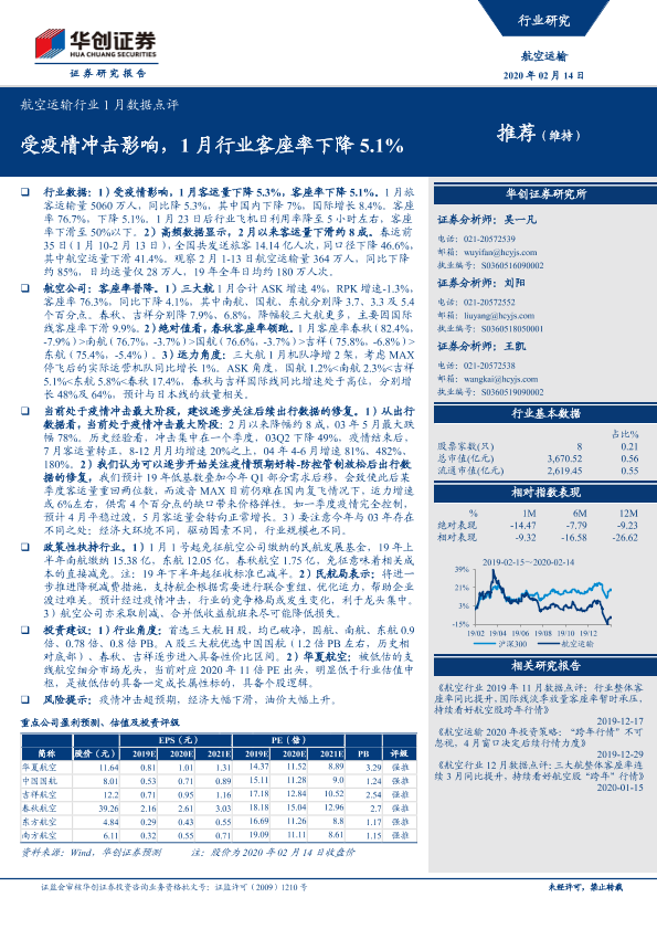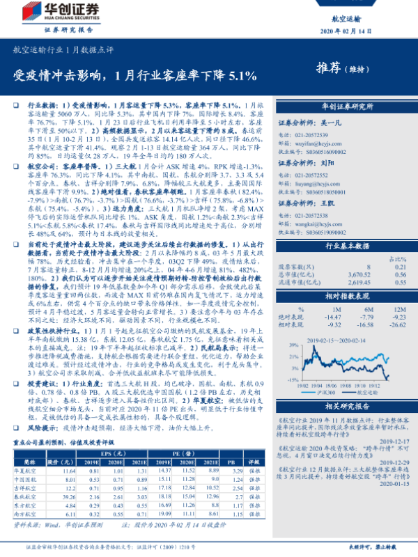 【华创证券】【20200214】航空运输行业1月数据点评:受疫情冲击影响,1月行业客座率下降5.1%-10页