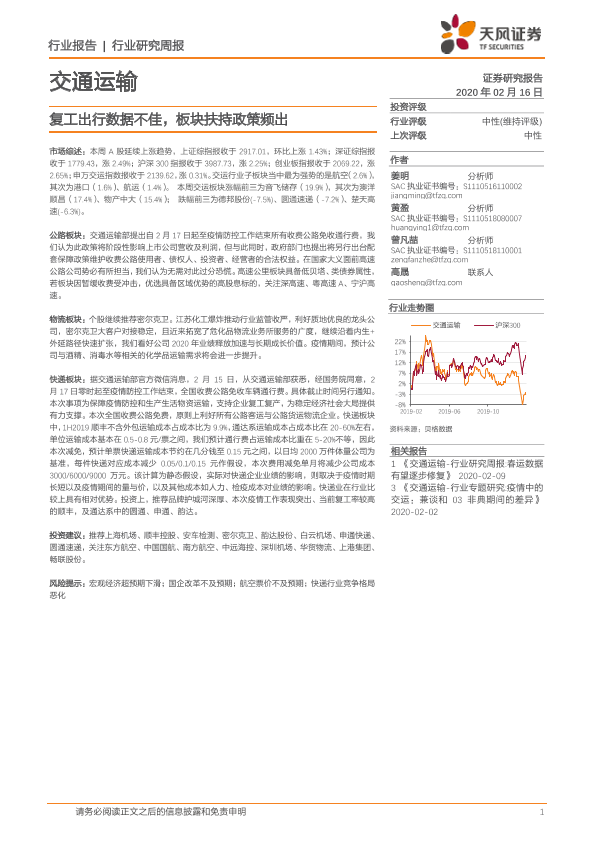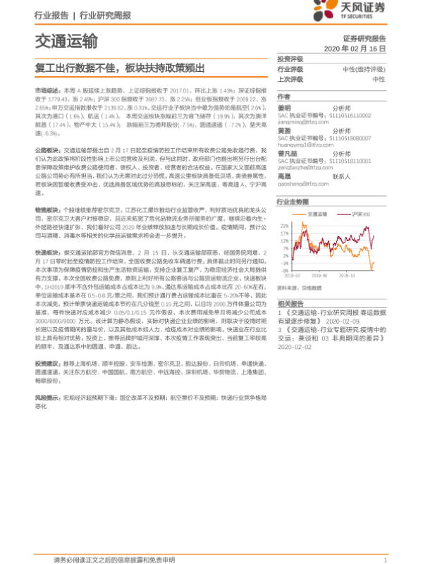 【天风证券】【20200216】交通运输行业研究周报:复工出行数据不佳,板块扶持政策频出-13页