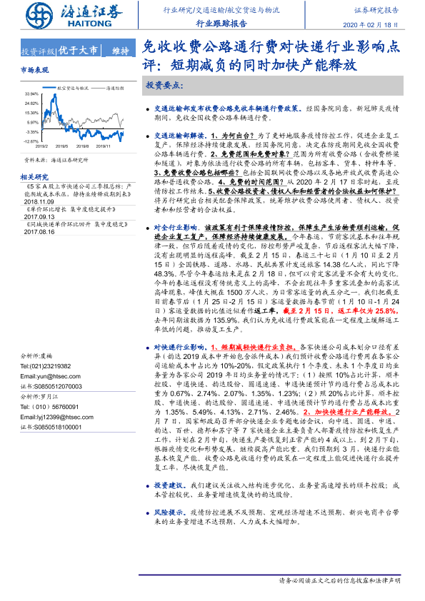 【海通证券】【20200218】免收收费公路通行费对快递行业影响点评:短期减负的同时加快产能释放-4页