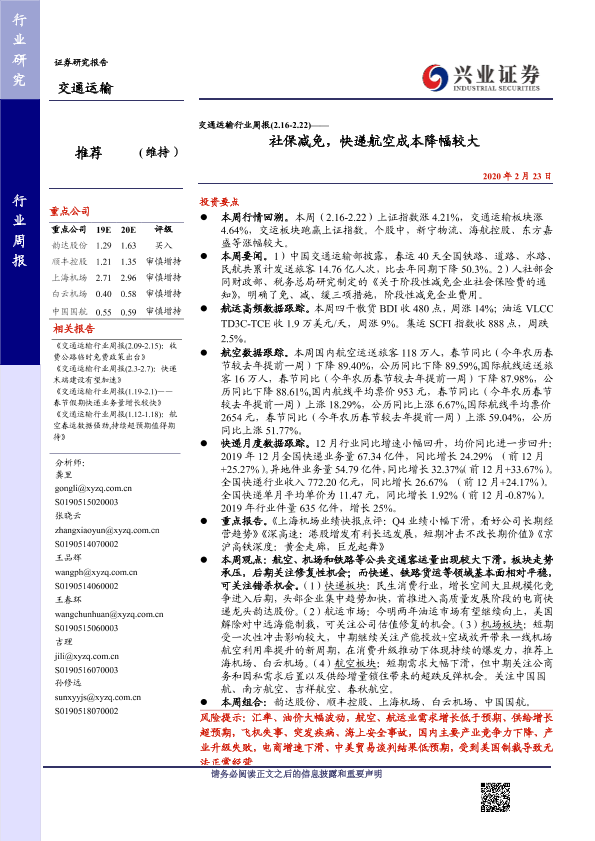 【兴业证券】【20200223】交通运输行业周报:社保减免,快递航空成本降幅较大-18页