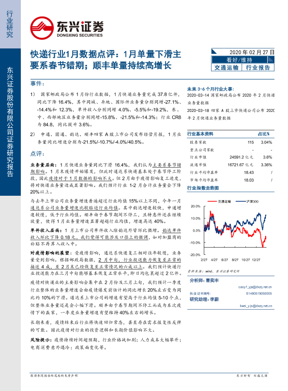 【东兴证券】【20200227】快递行业1月数据点评:1月单量下滑主要系春节错期;顺丰单量持续高增长-9页