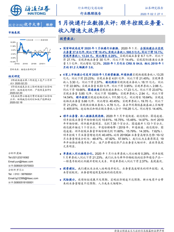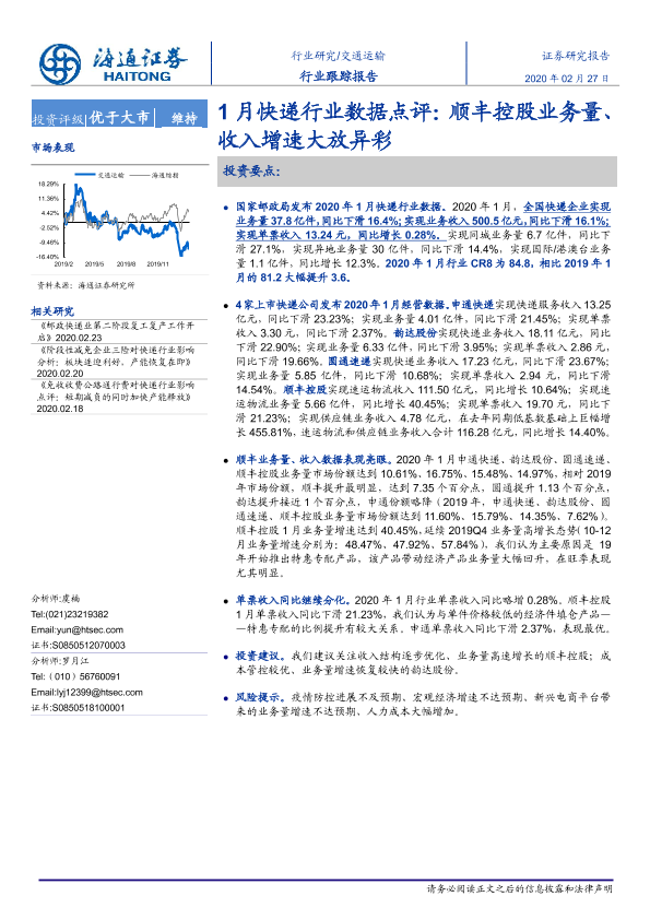 【海通证券】【20200227】1月快递行业数据点评:顺丰控股业务量、收入增速大放异彩-4页