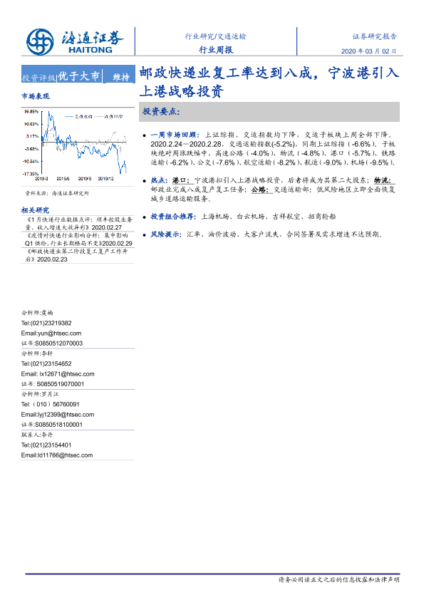 【海通证券】【20200302】交通运输行业周报:邮政快递业复工率达到八成,宁波港引入上港战略投资-7页
