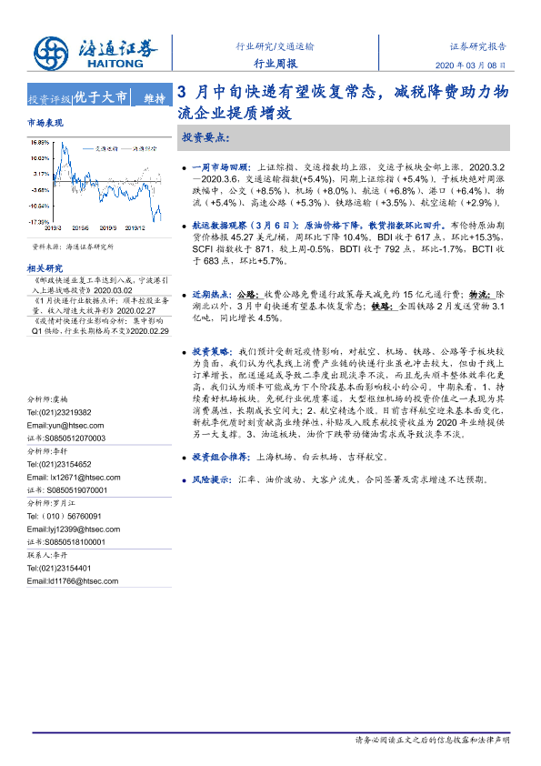 交通运输 减税降费 快递恢复 物流运输 行业周报