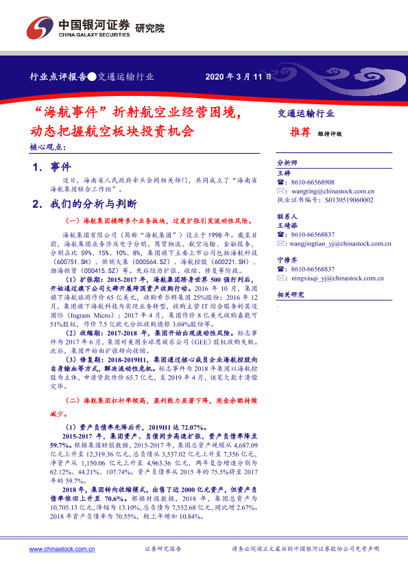 【银河证券】【20200311】“海航事件”折射航空业经营困境,动态把握航空板块投资机会-7页