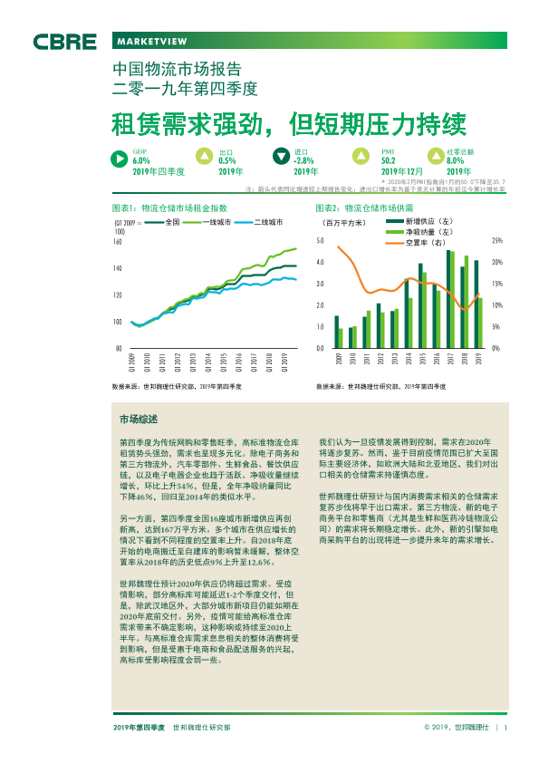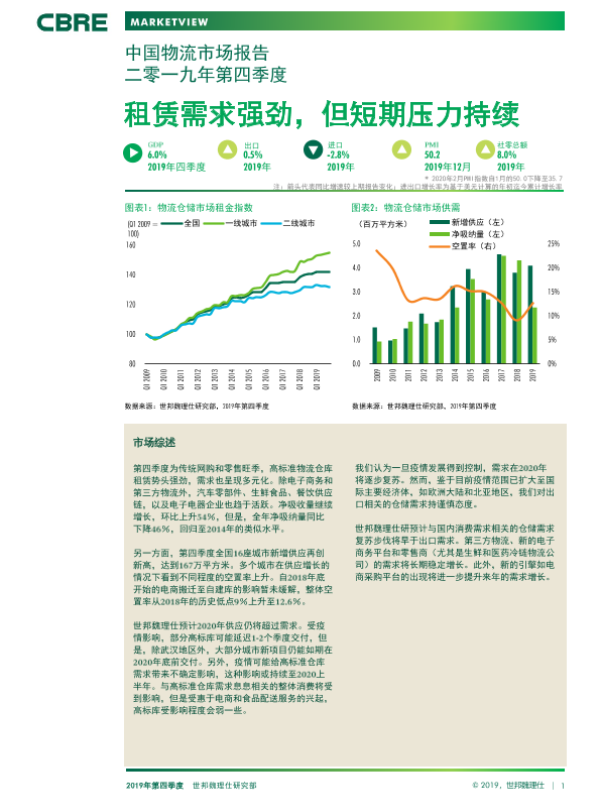 【世邦魏理仕】【20200314】中国物流市场报告二零一九年第四季度:租赁需求强劲,但短期压力持续-9页