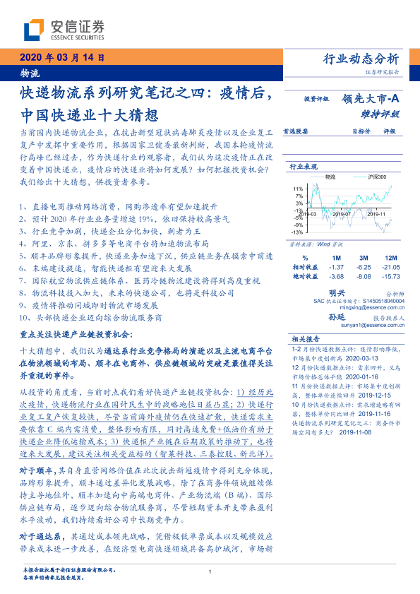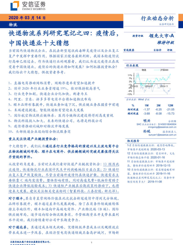 【安信证券】【20200314】物流行业动态分析:快递物流系列研究笔记之四:疫情后,中国快递业十大猜想-13页