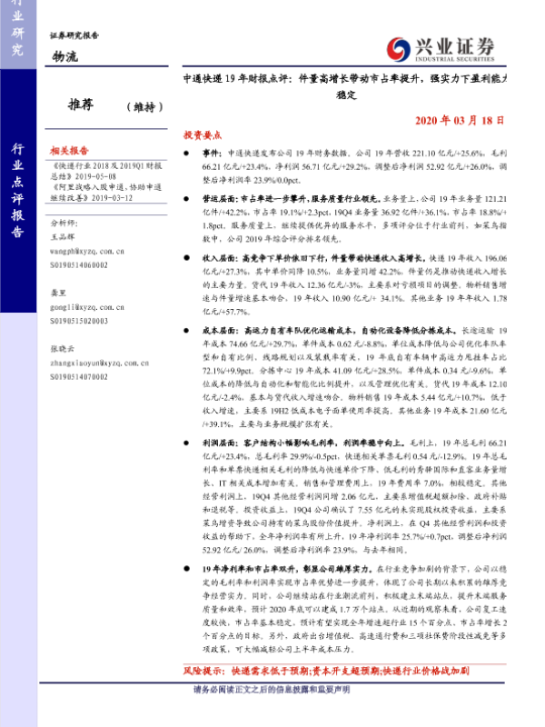 【兴业证券】【20200318】中通快递19年财报点评:件量高增长带动市占率提升,强实力下盈利能力稳定-6页