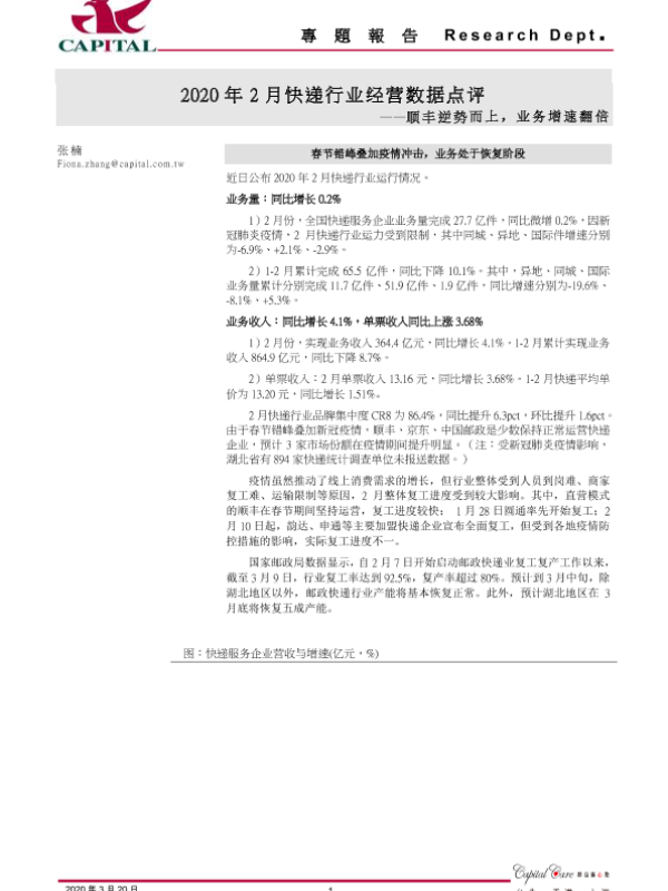【群益证券】【20200320】2020年2月快递行业经营数据点评:顺丰逆势而上,业务增速翻倍-7页