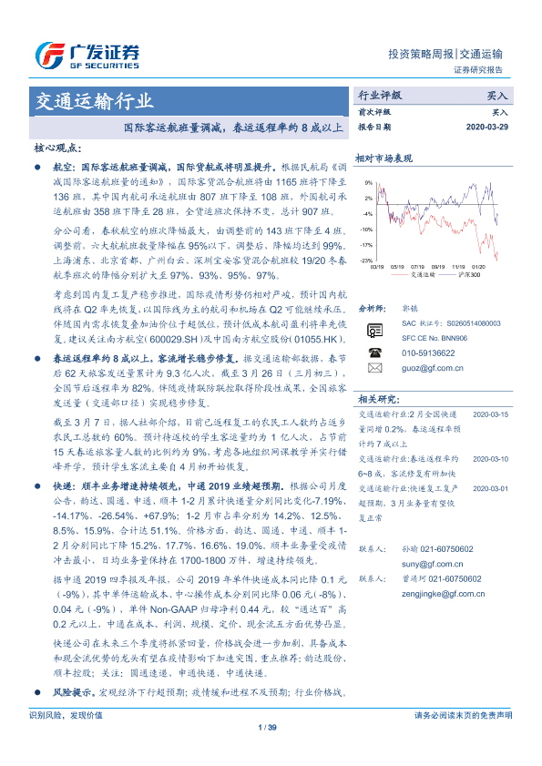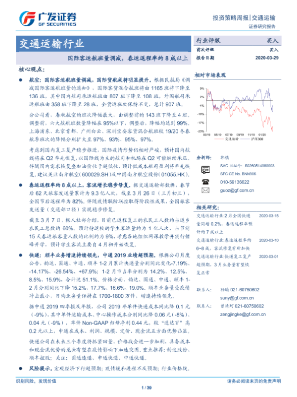 【广发证券】【20200329】交通运输行业投资策略周报:国际客运航班量调减,春运返程率约8成以上-39页