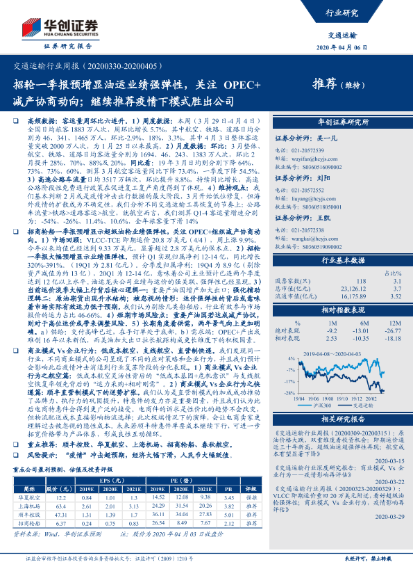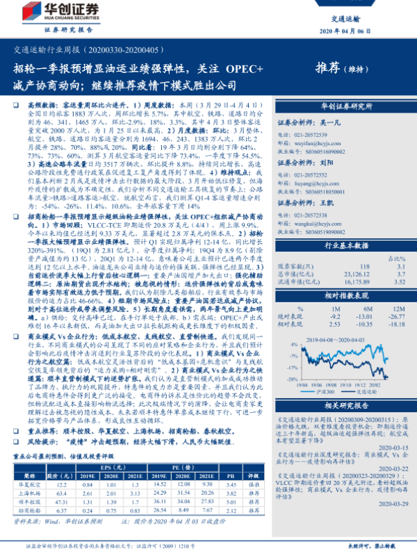 【华创证券】【20200406】交通运输行业周报:招轮一季报预增显油运业绩强弹性,关注OPEC+减产协商动向;继续推荐疫情下模式胜出公司-20页