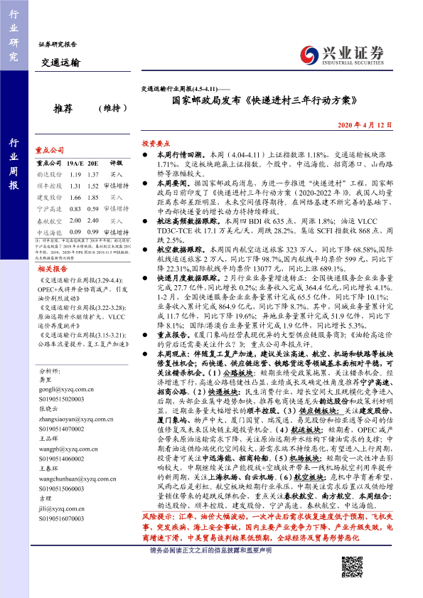 【兴业证券】【20200412】交通运输行业周报——国家邮政局发布《快递进村三年行动方案》-17页