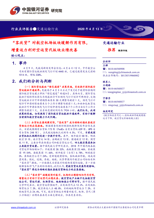【银河证券】【20200413】“客改货”对航空机场板块缓解作用有限,增量运力利好空运货代板块业绩改善-5页