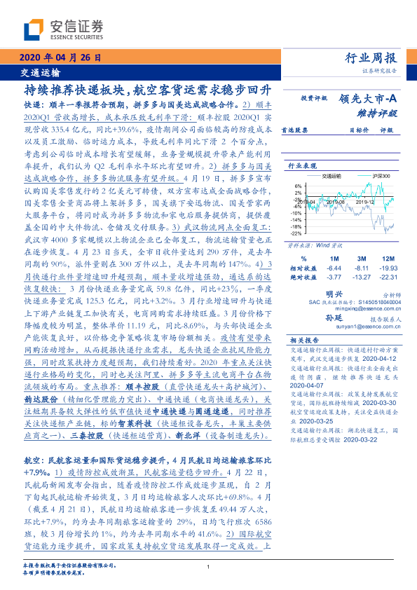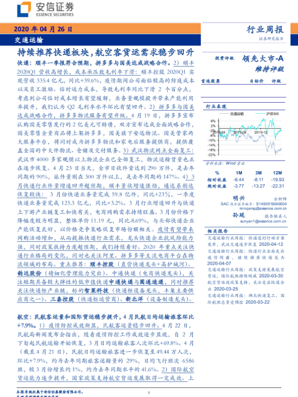 【安信证券】【20200426】交通运输行业周报:持续推荐快递板块,航空客货运需求稳步回升-19页
