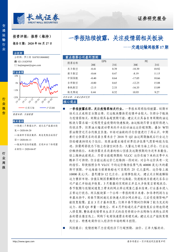【长城证券】【20200427】交通运输周报第17期:一季报陆续披露,关注疫情弱相关板块-21页