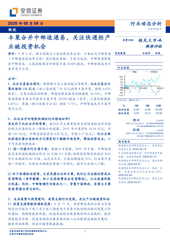 【安信证券】【20200506】物流行业动态分析:丰巢合并中邮速递易,关注快递柜产业链投资机会-6页